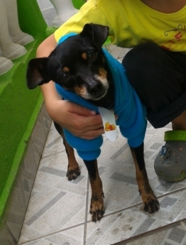 Eu recolhi esse cachorrinho da rua, estava machucado, eu cuidei dele, levei no veterinário ele está saudável, vermifugado. Estou dando lar temporário pra ele. É um Pinsher, macho, o veterinário acredita que tenha uns 7 ou 8 anos. Ele é pequeno, tem 3,5kg. Se alguém se interessar adotá-lo, em dar um novo lar e uma nova família pra ele, por favor, é só falar comigo. Se vc mora na região de Cumbica-Guarulhos, e perdeu seu cachorrinho e bater com essas características, entre em contato, pode ser o seu cachorro. Ele usava uma coleirinha preta com estrelas de metal quando o encontramos.