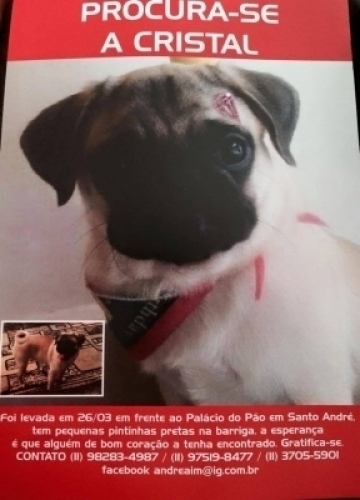 Fui assaltada em 26/03, em frente ao estacionamento da Padaria Palácio do Pão em Santo André, os assaltantes (3 homens armados), levaram o carro ASX Preta e junto estava minha cadelinha Cristal (PUG fêmea de 8 meses), me arrancaram do carro e saíram em disparada, já panfletei os bairros e comunidades próximas e nada.
