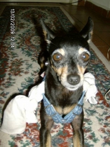 Cachorra Pincher preta, com 12 anos, cabeça branquinha de velhinha, fugiu em Barueri do Jd. Silveira, vista no Jd. Belval